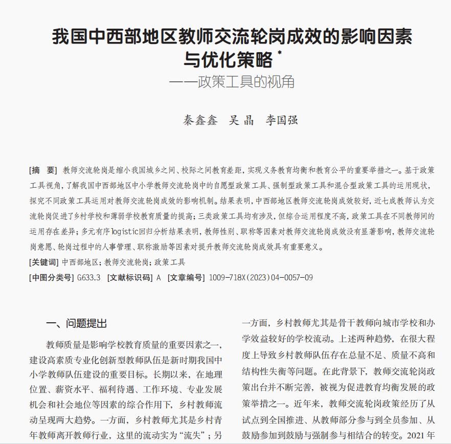 秦鑫鑫. 我国中西部地区教师交流轮岗成效的影响因素与优化策略