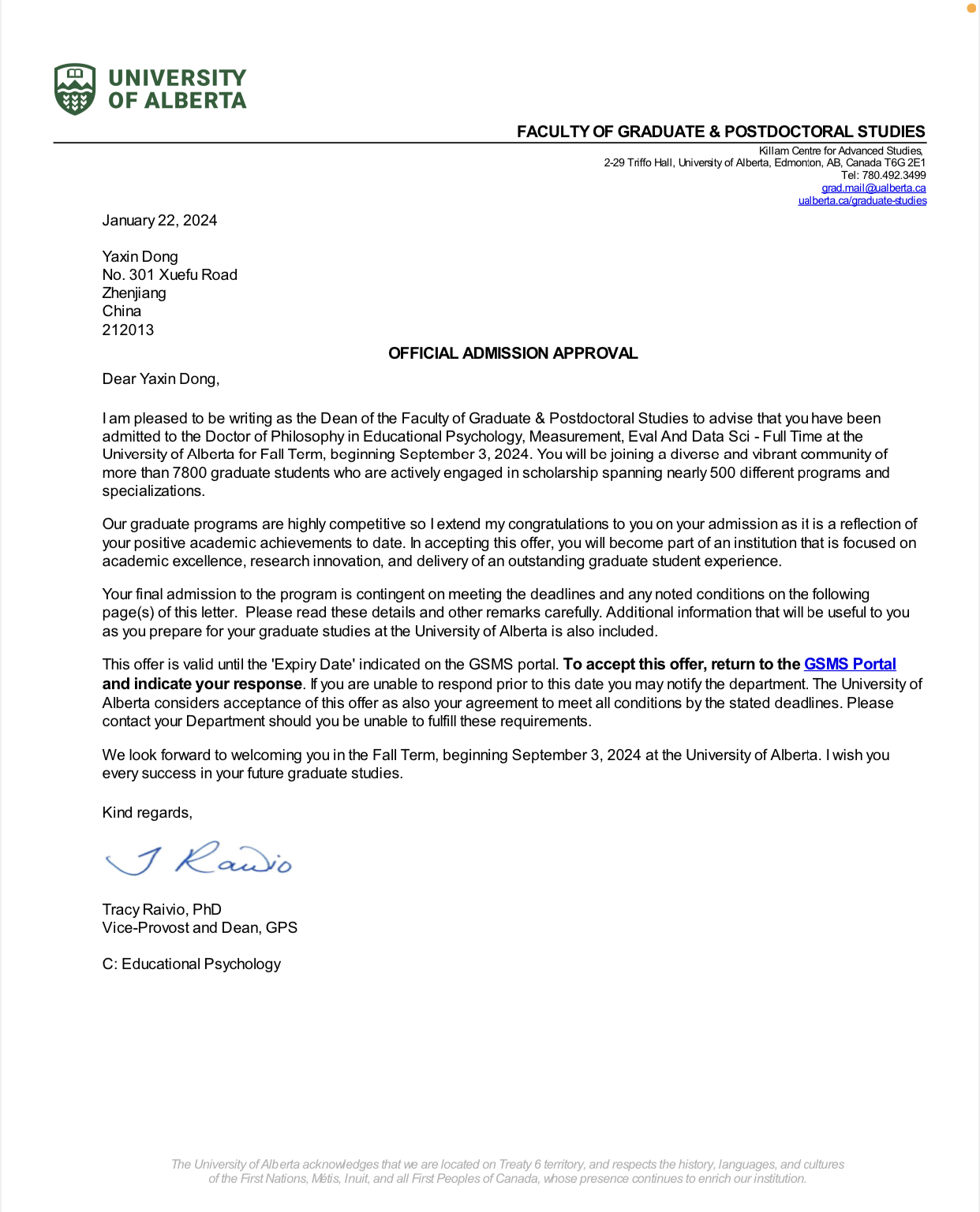 近日,我院黄金岩教授2021级教育测评与研究方法方向硕士研究生董雅鑫被加拿大阿尔伯塔大学(University of Alberta)录取为博士研究生,研究方向为“教育心理学、测量、评估与数据科学”,该方向在北美享有极高声誉,申请难度大。
