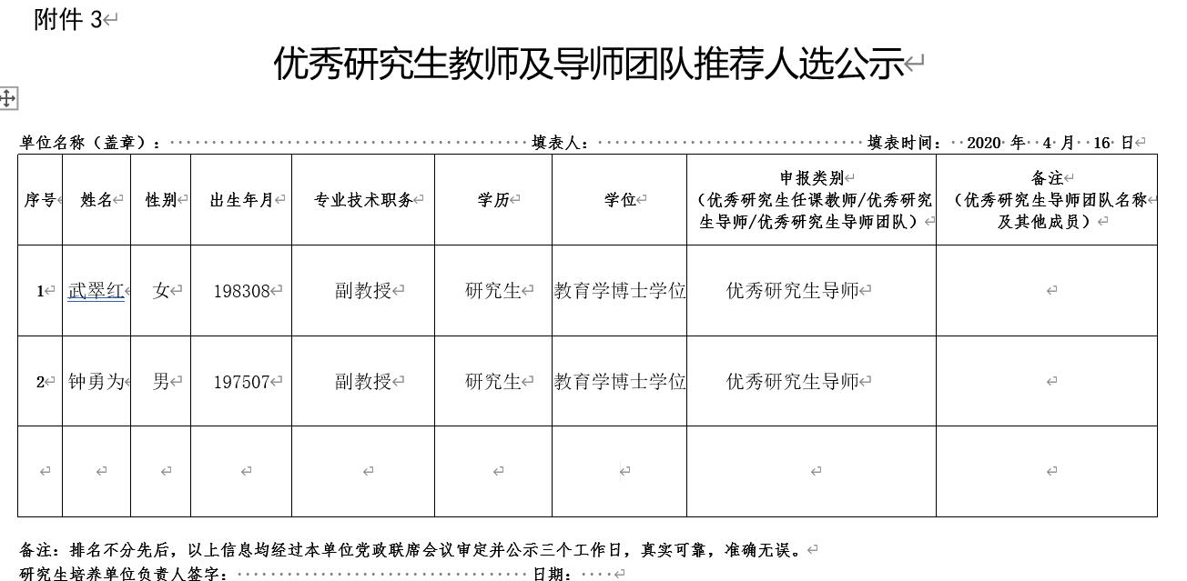 优秀研究生教师及导师团队推荐人选公示