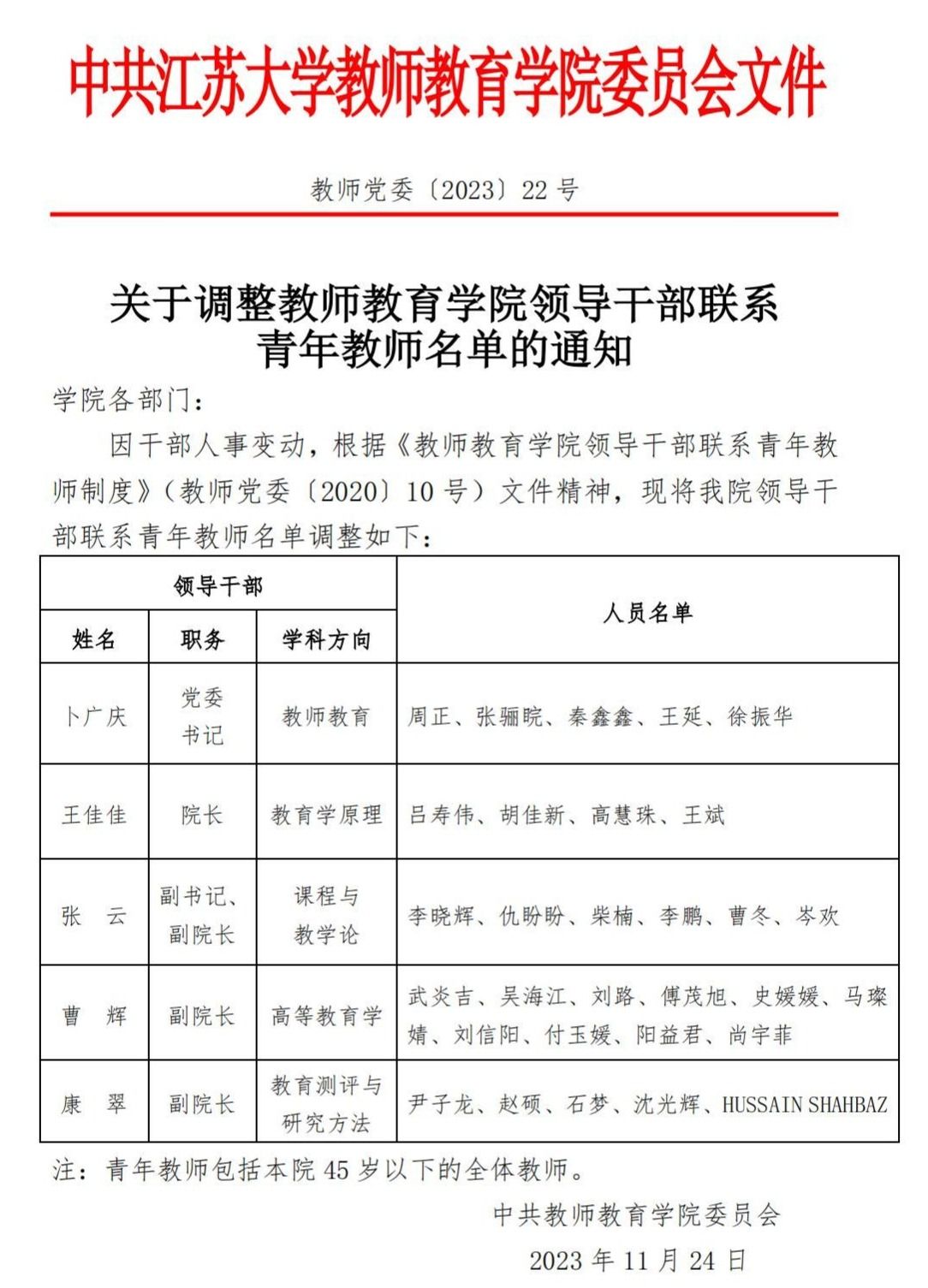 关于调整永利23411集团领导干部联系青年教师名单的通知