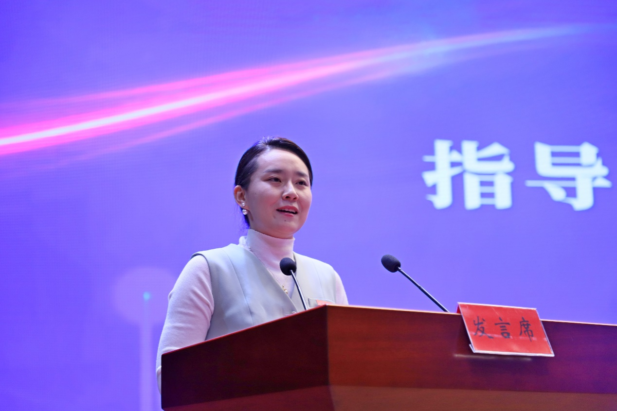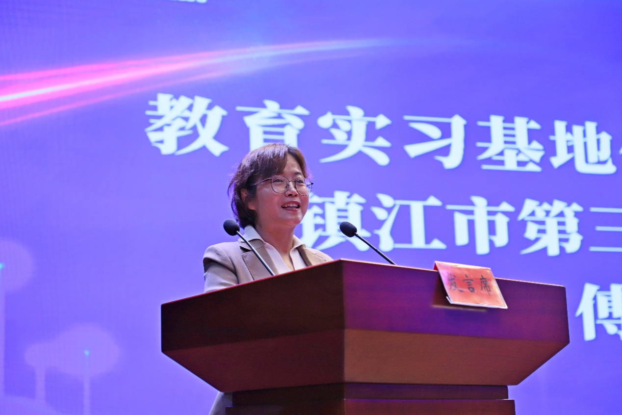 镇江第三中学副校长傅文霞作为教育实习基地代表发言。镇江三中为每一位实习生选聘师德高尚、以身作则、教学水平高、教学效果好的骨干教师作为教学工作导师;选聘深受学生喜爱、班级管理水平高的优秀班主任作为实习生的班主任工作导师;定期组织实习生参加校内教学研讨会。