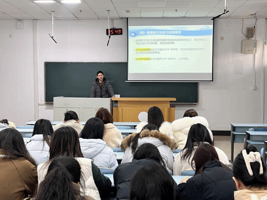 动员会上,蔡老师首先强调同学们要明确实习动机,树立正确的实习目标,不仅应将教育实习当作专硕实践的重要环节,更应重视其在个人教师职业发展中的关键作用。随后,蔡老师详细阐述了教育实习的各项任务,包括教学实习、班主任工作、阶段性反思、教学研讨、实习总结等的完成标准以及成果呈现方式,帮助同学们清晰规划实习过程。最后,蔡老师重点强调了实习安全须知,提醒同学们在实习期间务必增强安全意识,严格遵守实习单位的各项安全规定,确保自身安全与实习顺利进行。